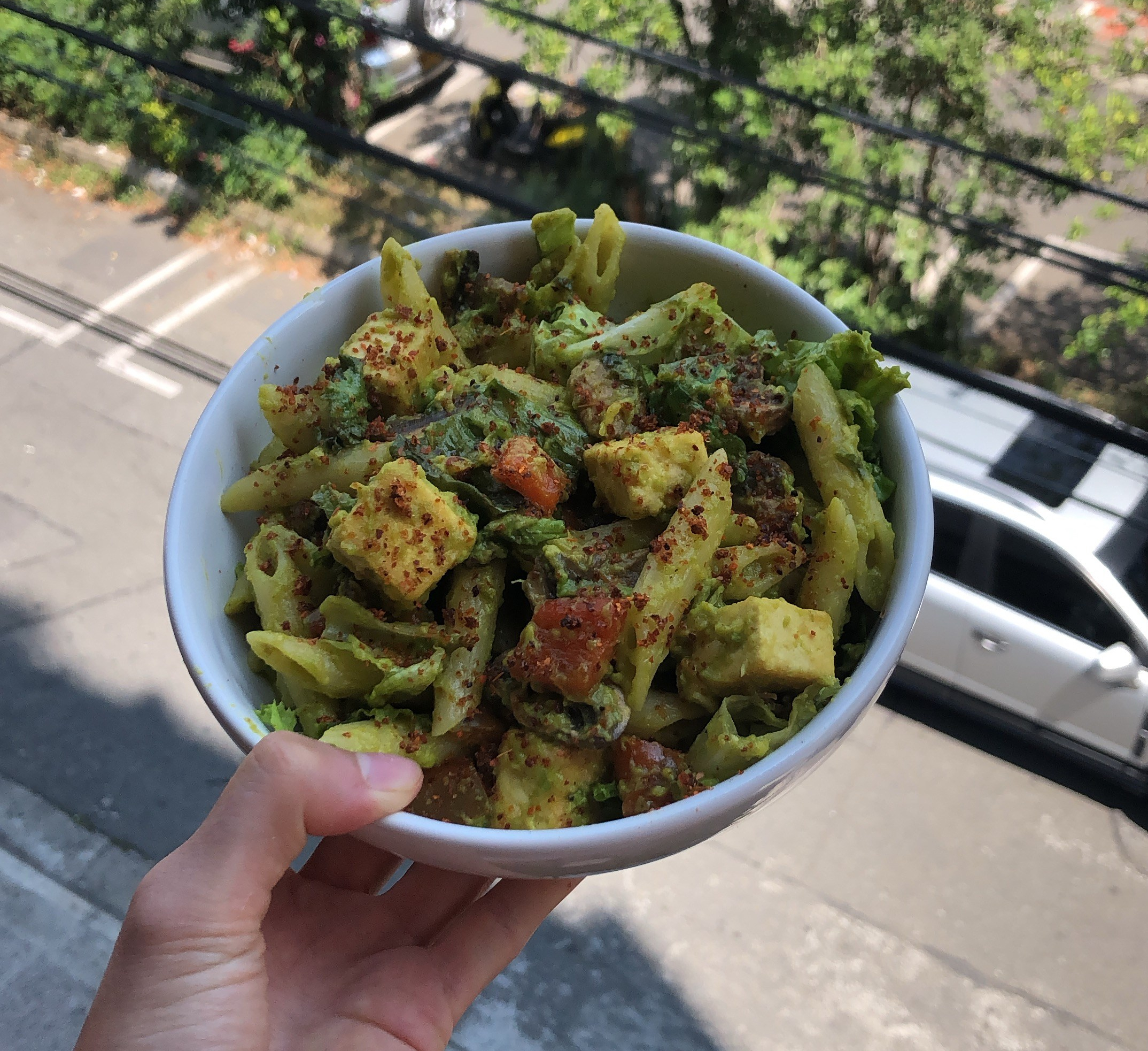 - Place the pasta, with the retained cooking water, back into the pan. Add the avocado, salad ingredients and cooked tofu. Stir to coat all ingredients in avocado.